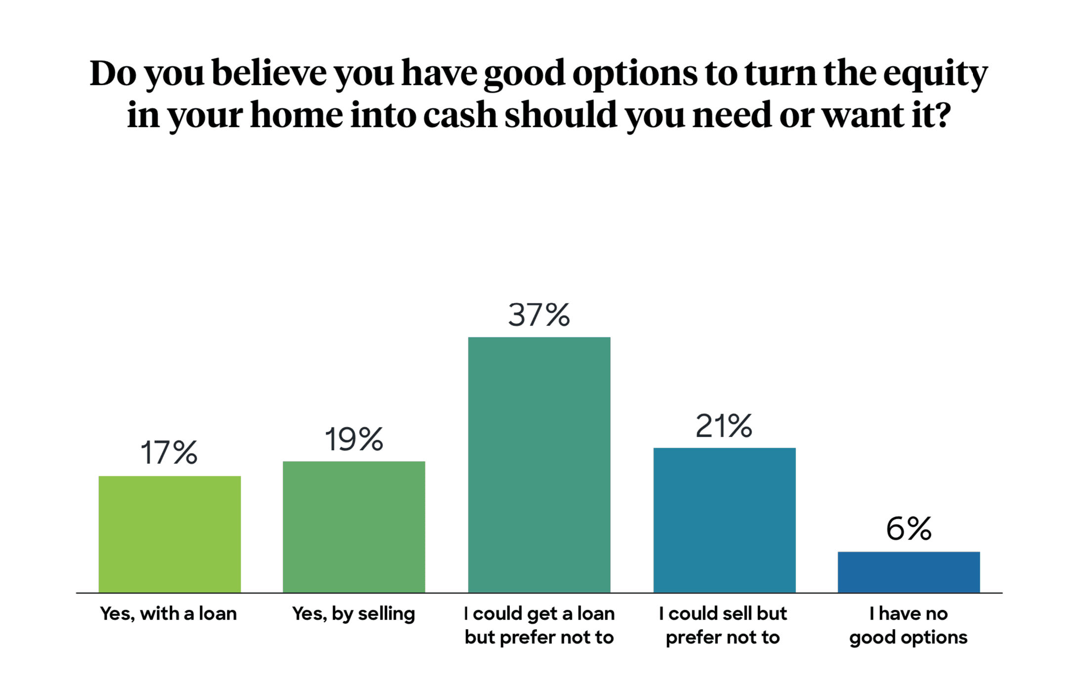 Yet 66 percent of Los Angeles homeowners in the study said they don’t feel like they have good options for turning the equity in their home into cash; 37 percent don’t want to take on a loan and the debt, interest, and monthly payments that come with it. Another 21 percent say they could sell their home to access equity but would prefer not to.
